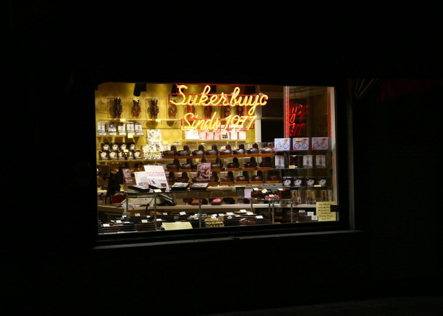The windows are calm. Boxes arranged without urgency. Pralines aligned, then slightly misaligned, as if someone adjusted them and then stopped caring about perfect symmetry. Inside, the room feels warmer than the pavement outside. There’s a softness to the light. It lands on polished counters and stays there.