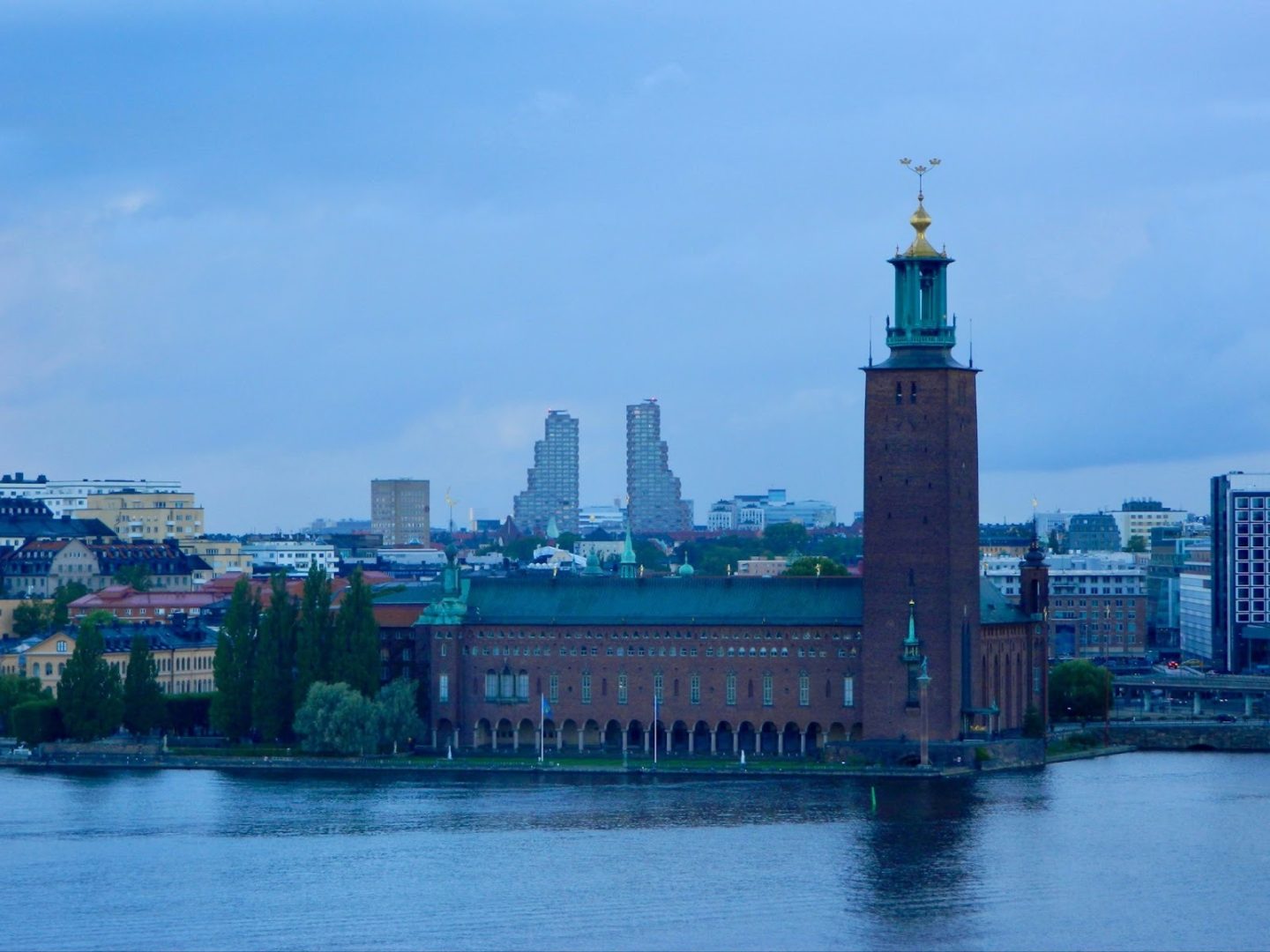 Stockholm City Hall rises beside the water without theatrical height. Its brick façade deepens under cloud, lightening again when sun returns. The tower narrows into sky in steady intervals, not as spectacle but as extension.