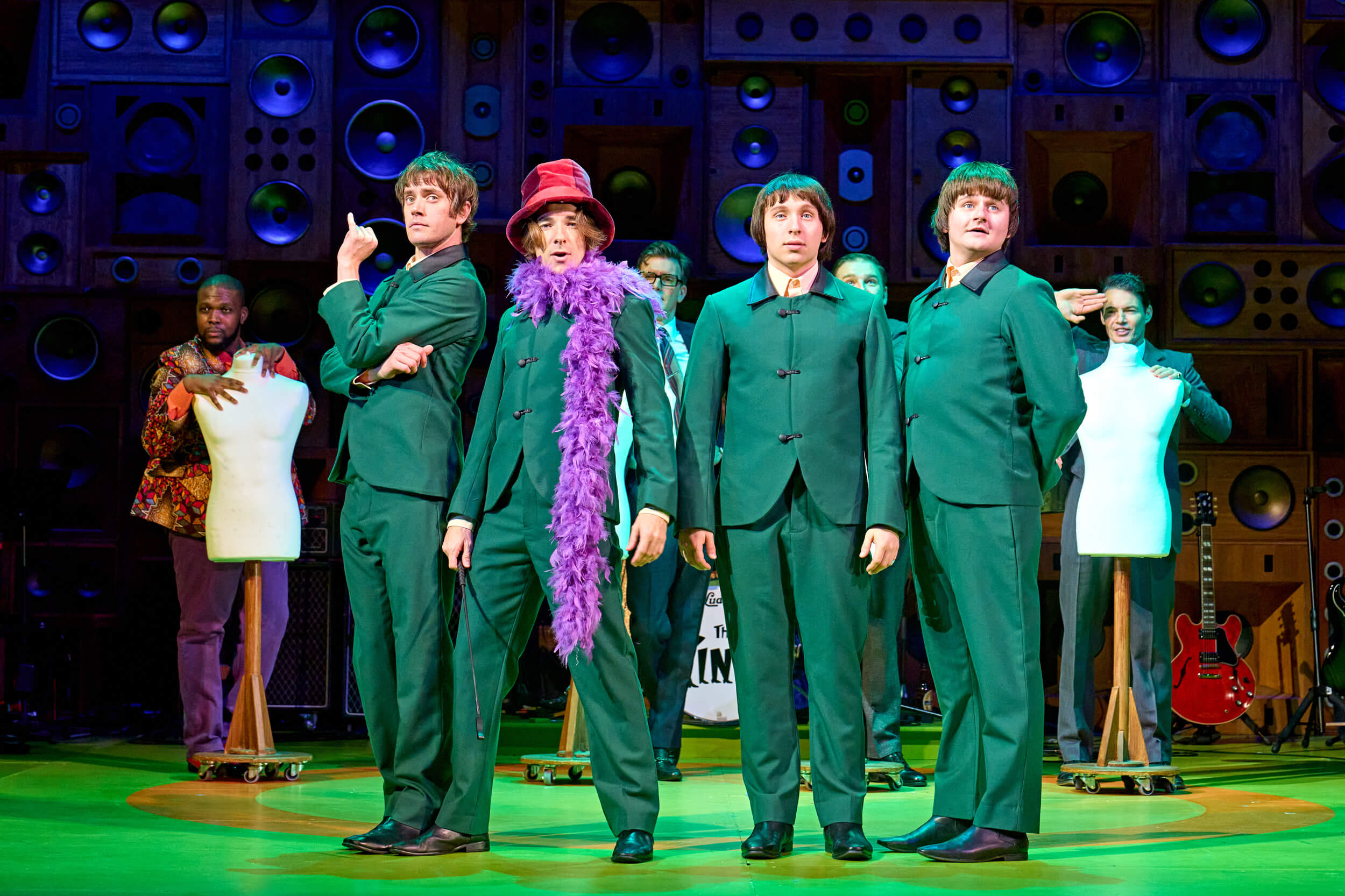 The band on stage playing in Sunny Afternoon - The Kinks Musical with the word TOP hanging from the ceiling
